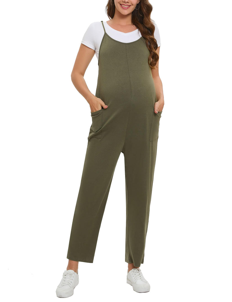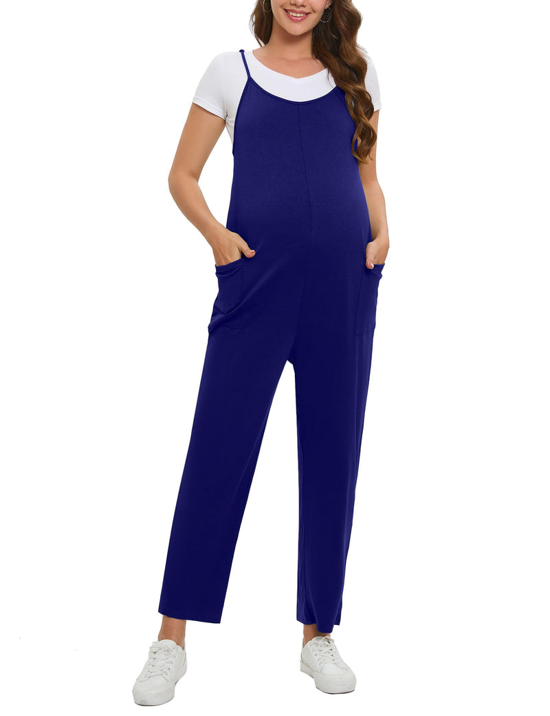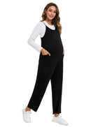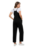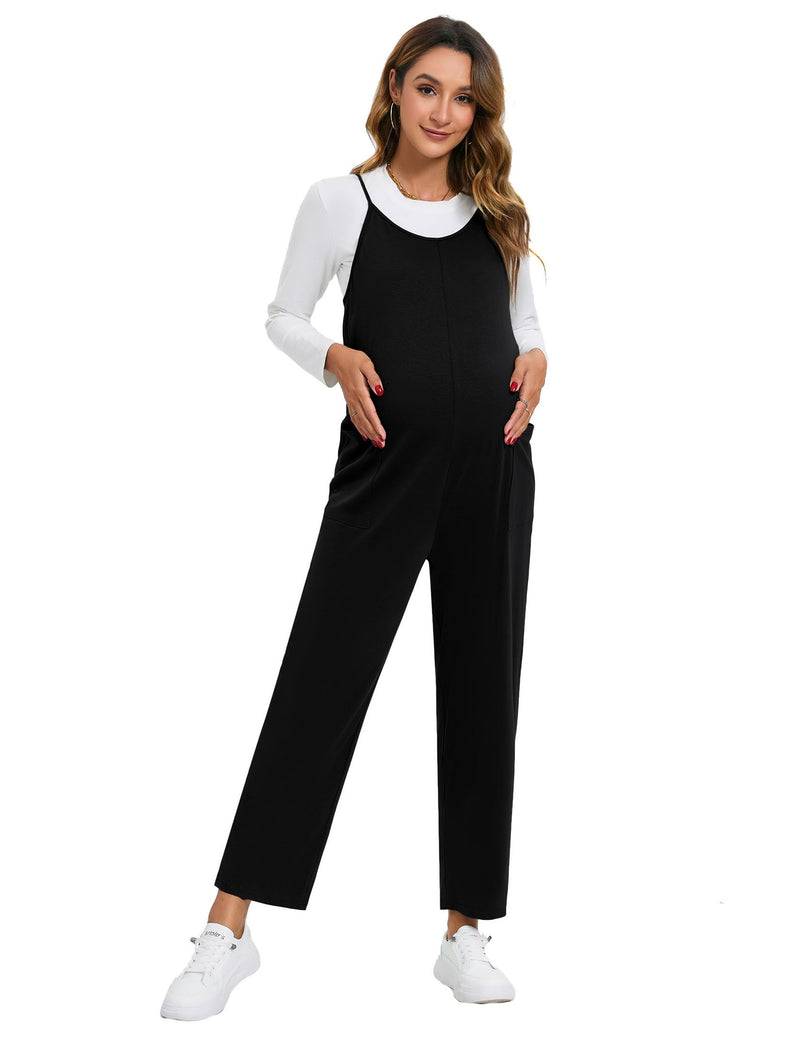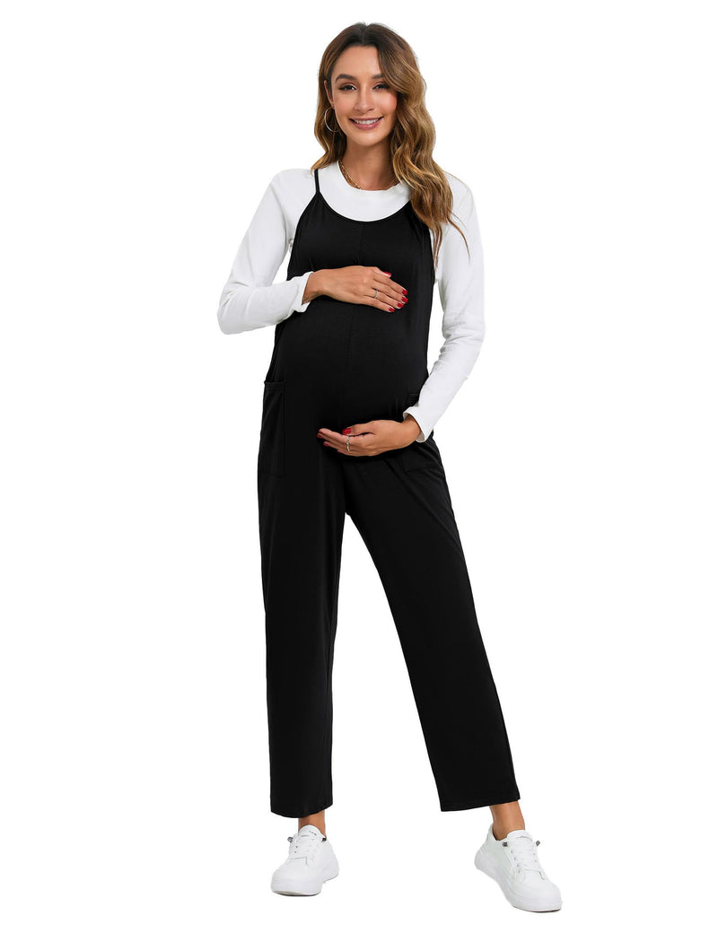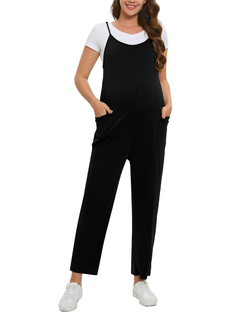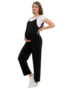YESFASHION Maternity Dual Pocket Cami Jumpsuits Women's Causal Loose Sleeveless Spaghetti Strap Wide Leg Romper Jumpsuit Black M