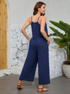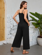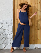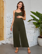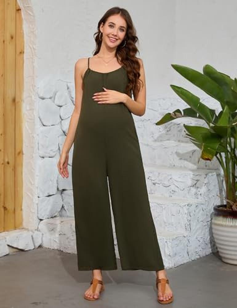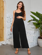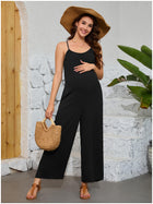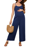 The maternity jumpsuit features sleeveless, adjustable spaghetti straps, side pockets, solid color, loose fit, casual style.