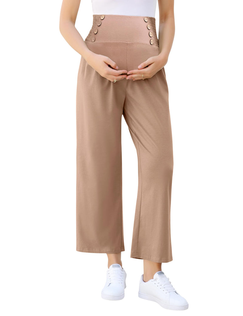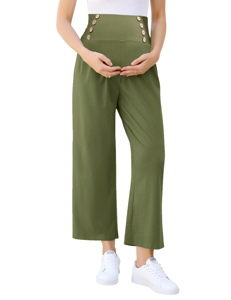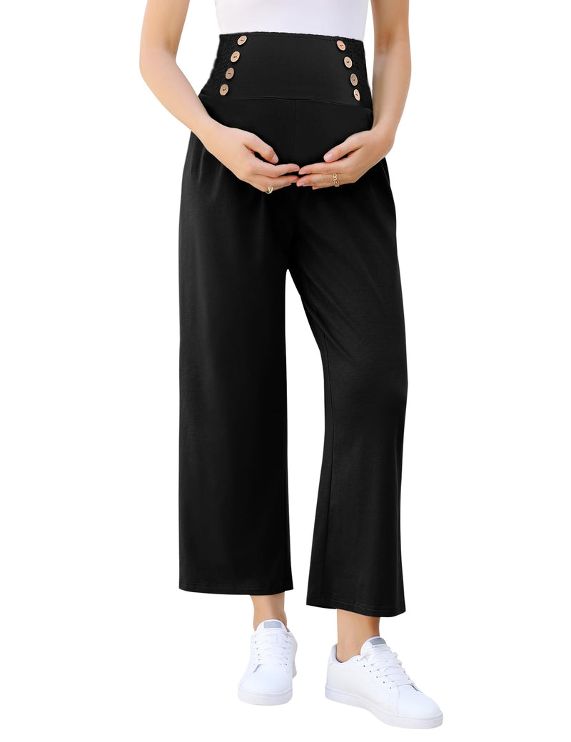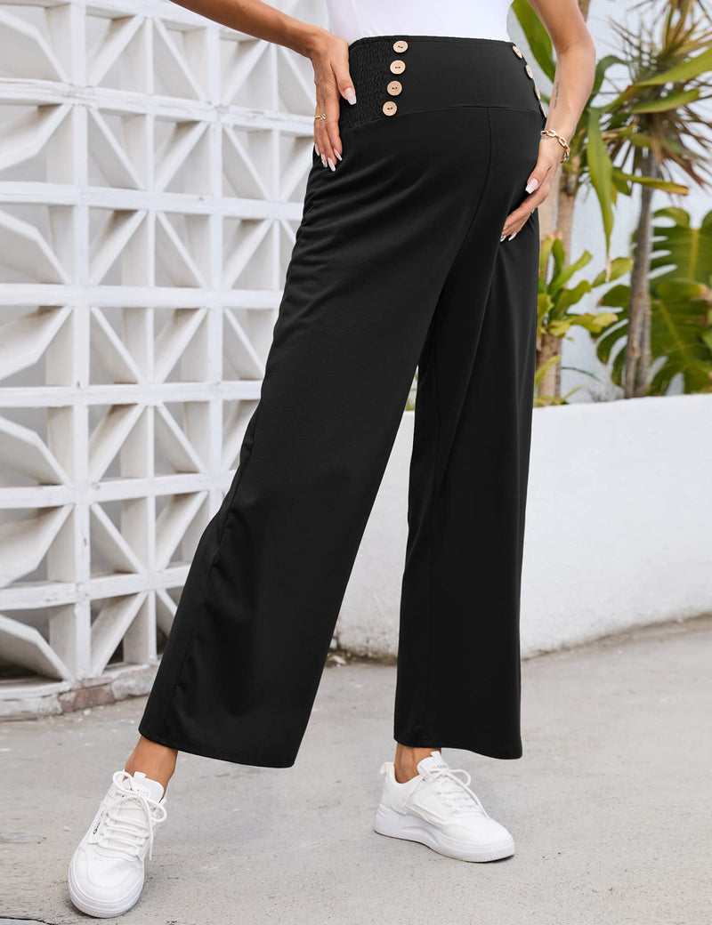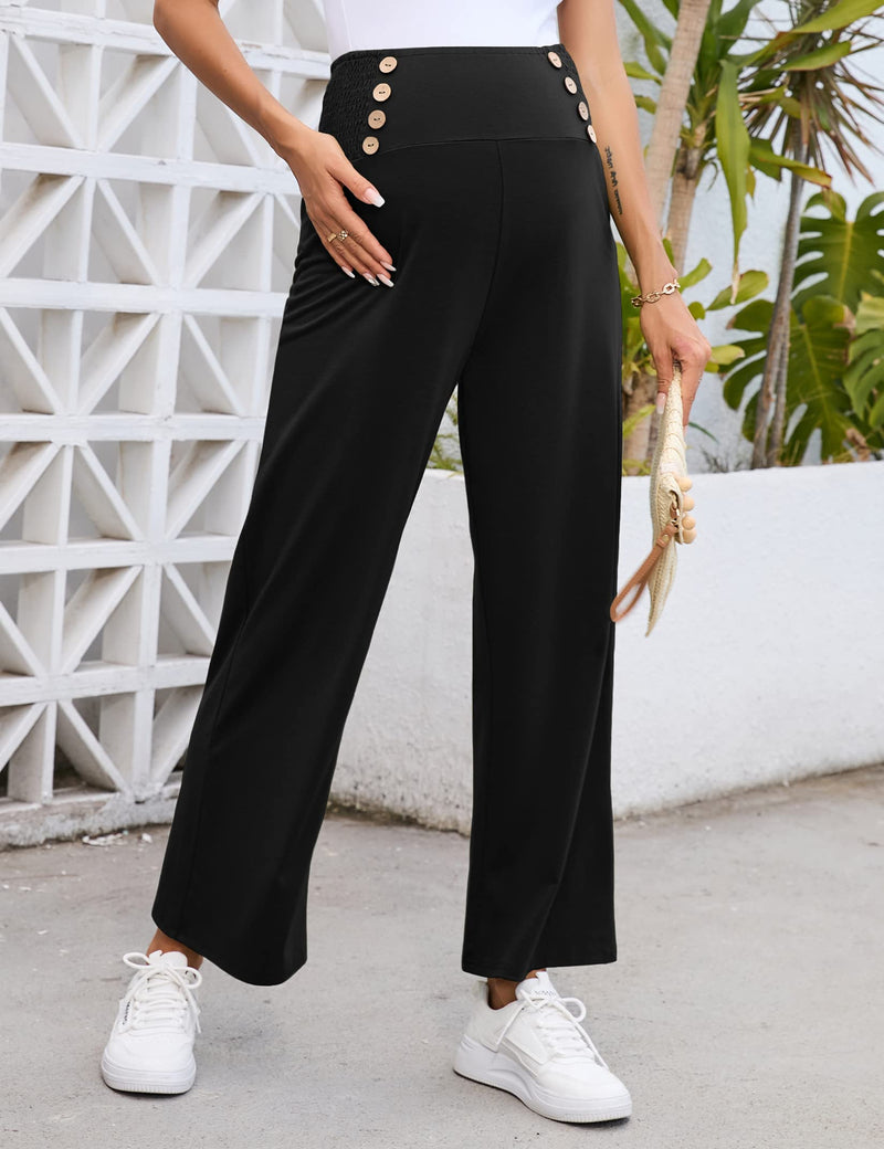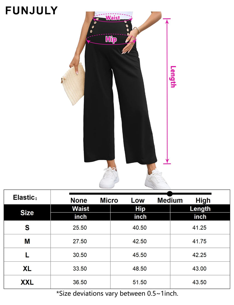 Full lengthNO pockets, Lightweight & Breathble.Double breasted decorationFlattering waist band design on both sidesLightweight, wide-leg flattering pants