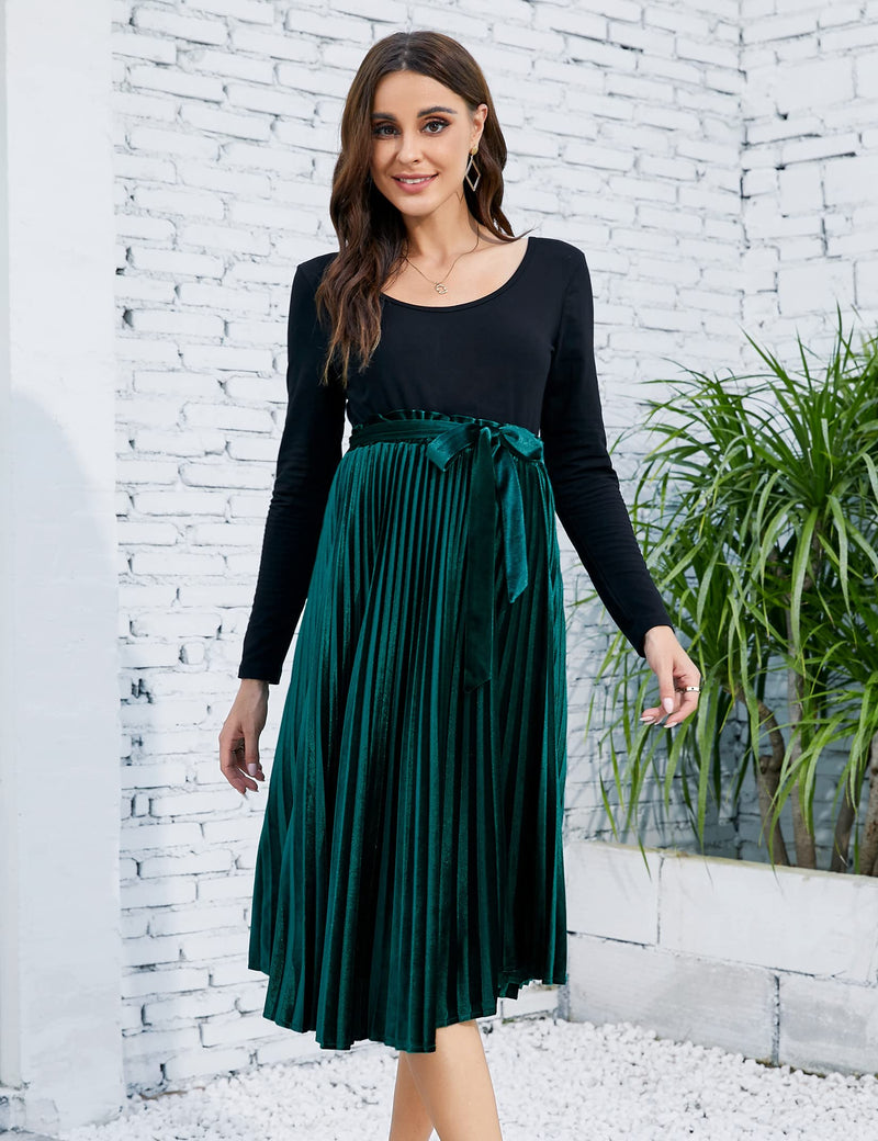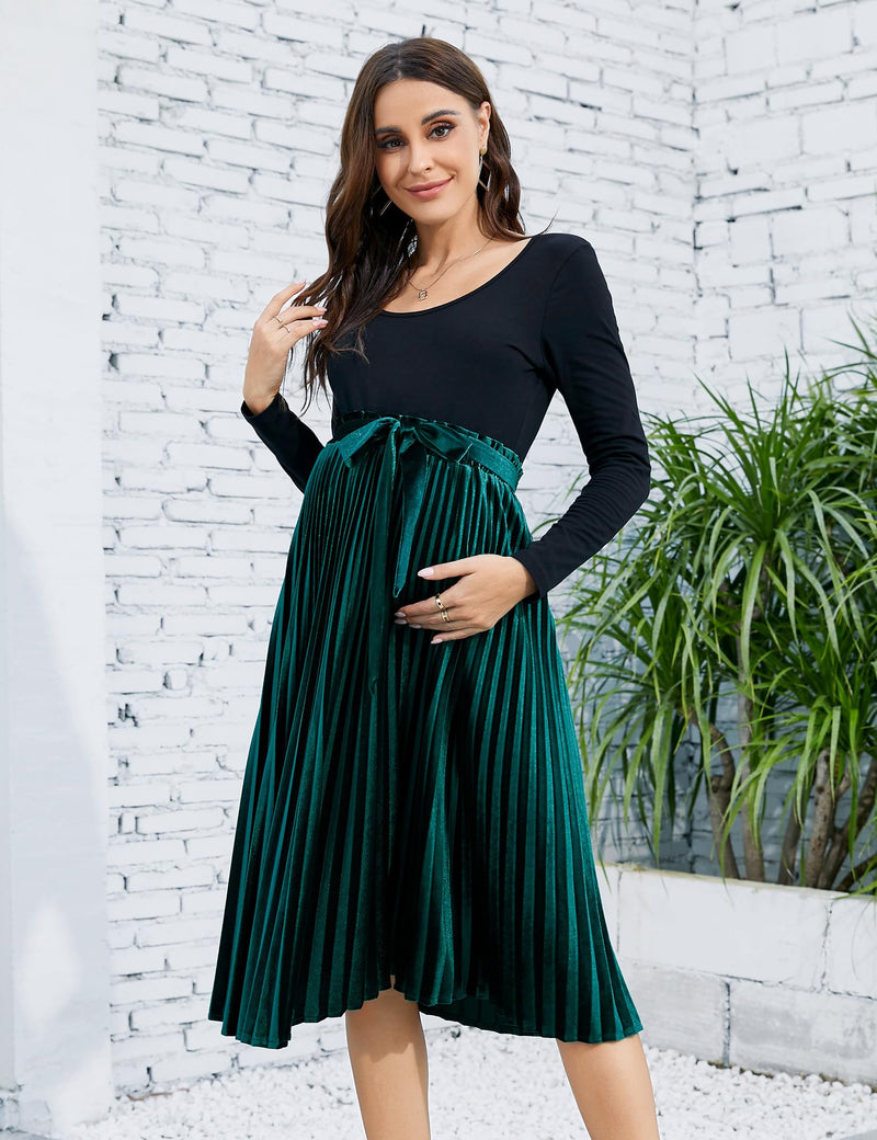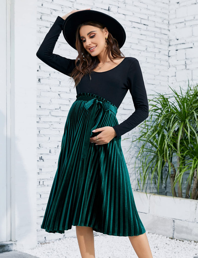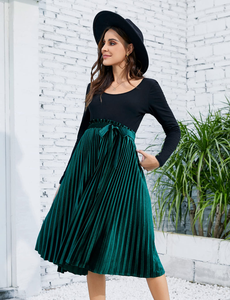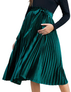 YESFASHION Maternity Skirts Velvet High Elastic Waisted A Line Pleated Ruffle Holiday Skirt with Belt, Dark Green, X-Large