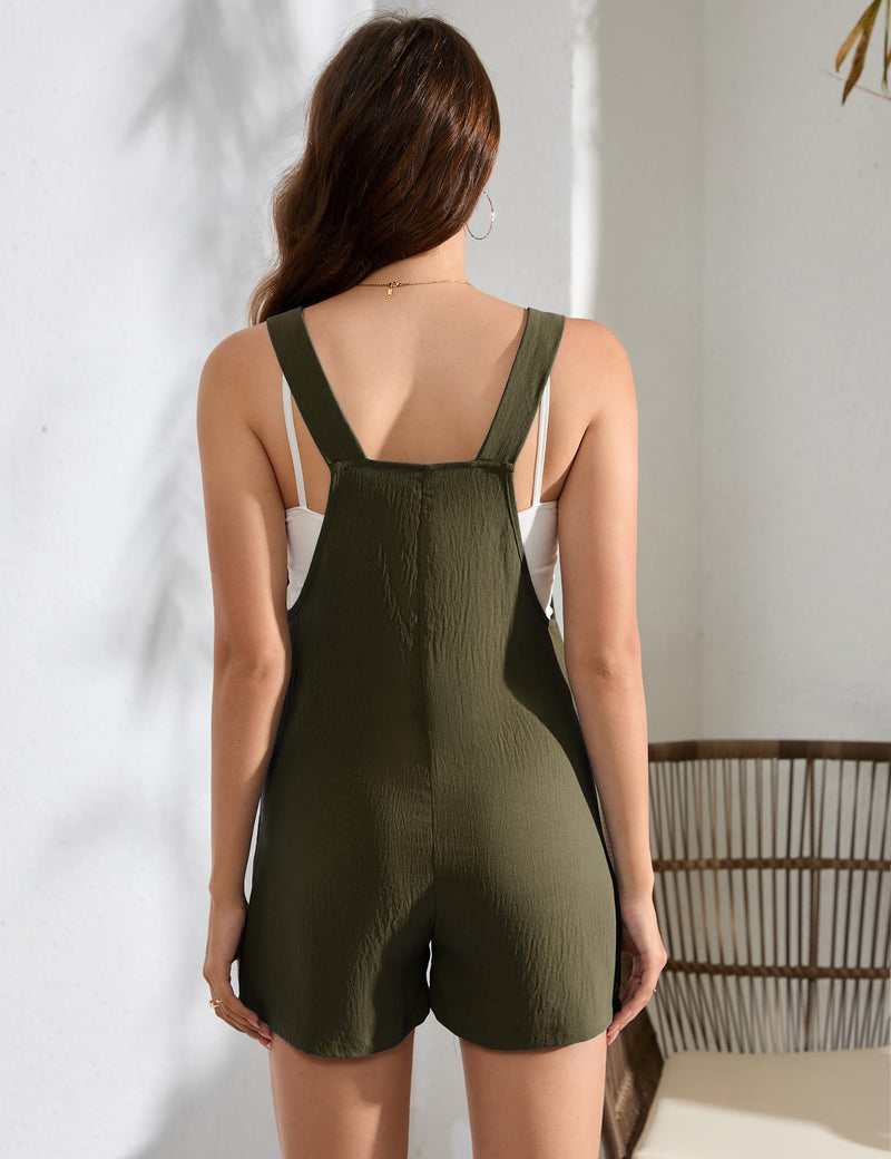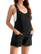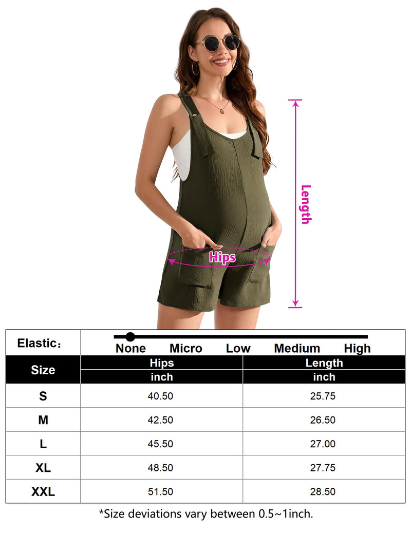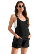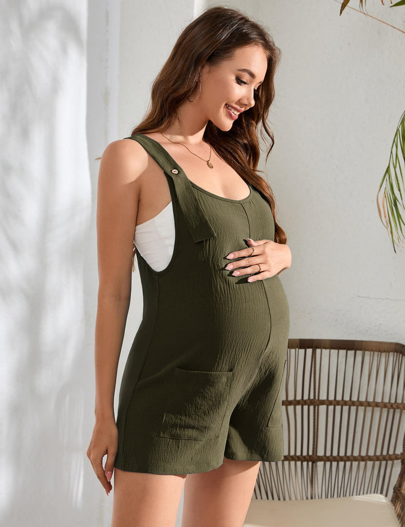 The maternity shorts overall features sleeveless, adjustable straps with button, side pockets, solid color, loose fit, casual style.
